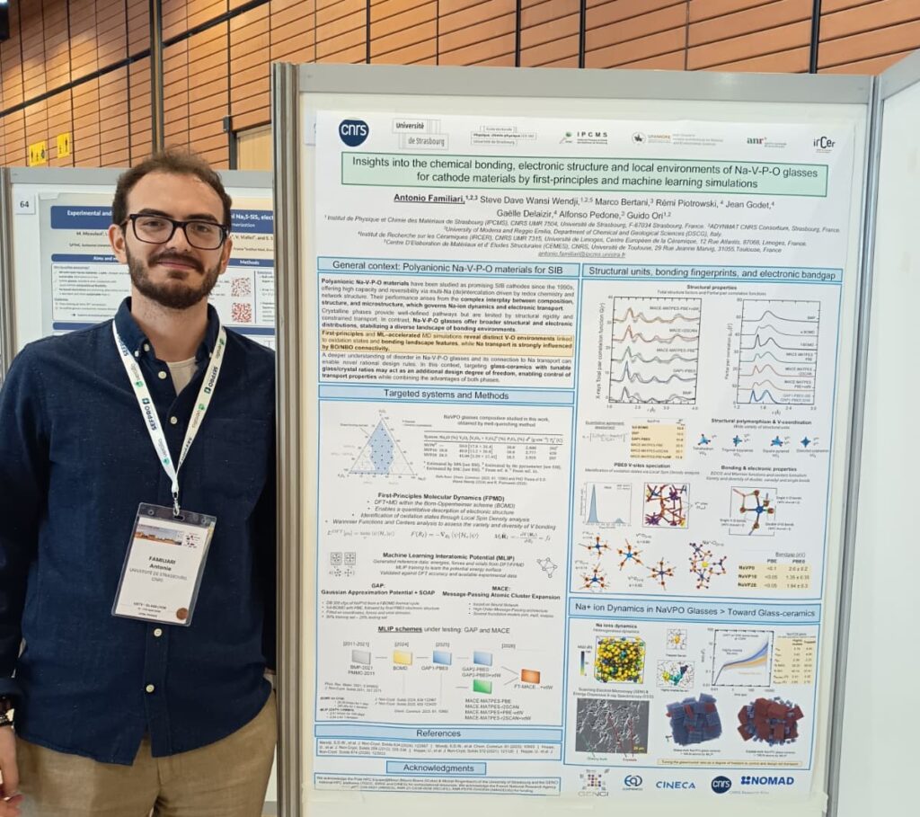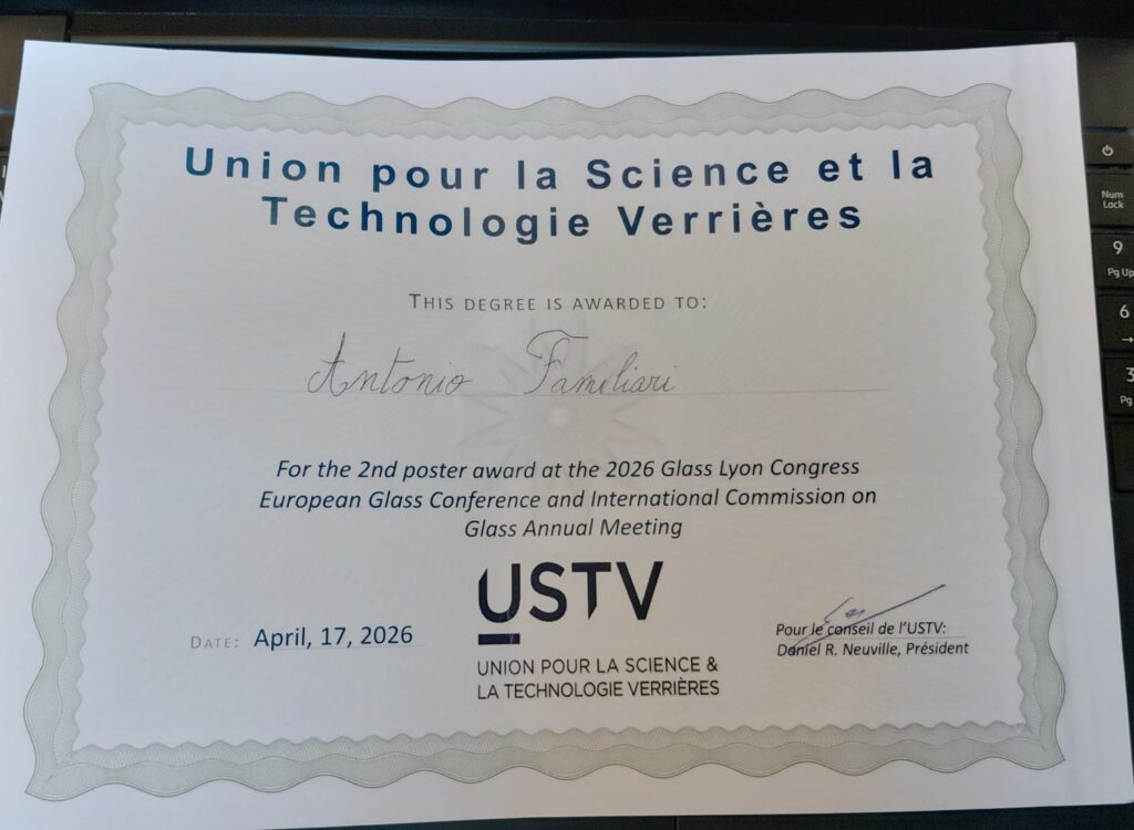Antonio won the 2nd Poster Award presented by USTV (Union for Science and Technology in Verrières) at the International Commission on Glass – Annual Meeting: GLASS LYON 2026, with a poster entitled: “Insights into the chemical bonding, electronic structure and local environments of Na-V-P-O glasses for cathode materials by first-principles and machine learning simulations”.