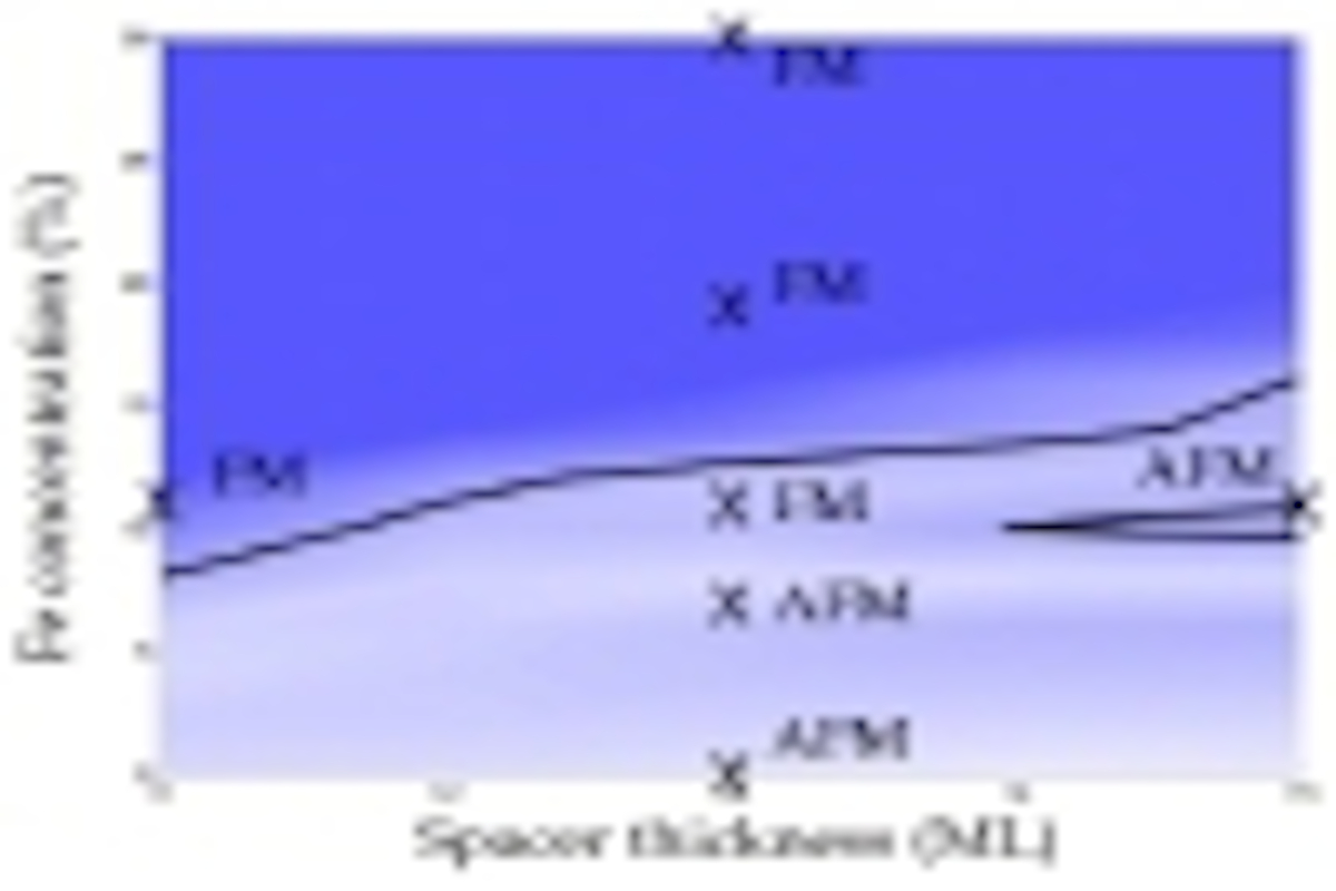 Magnetic phase diagram for Fe3/(FexV1—x-)n. The calculations include interface intermixing of -1.8 and a roughness of 1.35. The strength of the calculated IEC is represented by the blue scale (gray scale in the black and white version of the figure) where dark shades represent FM coupling and light shade represents AFM coupling. The black lines represent the border between the theoretical FM and AFM solutions. The experimental points are marked by X. The theoretical phase diagram was obtained by a linear interpolation of calculations for V thicknesses in steps of integer ML and Fe concentrations in steps of 2%. The amplitudes of the AFM samples with our choices of intermixing and roughness are Fe3V1-3-(-0%)- 0.3115 mJ/m2, Fe3V1-3-(-7%)- 0.1773 mJ/m2, and Fe3V1-5-(-11%)- 0.0055 mJ/m2.