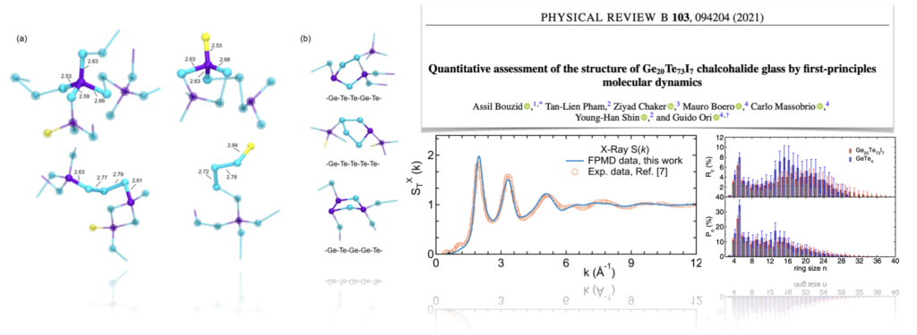 A. Bouzid, T.-L. Pham, Z. Chaker, M. Boero, C. Massobrio, Y.-H. Shin, G. Ori, Quantitative assessment of the structure of Ge20Te73I7 chalcohalide glass by first-principles molecular dynamics, Physical Review B 103 (2021) 094204.
